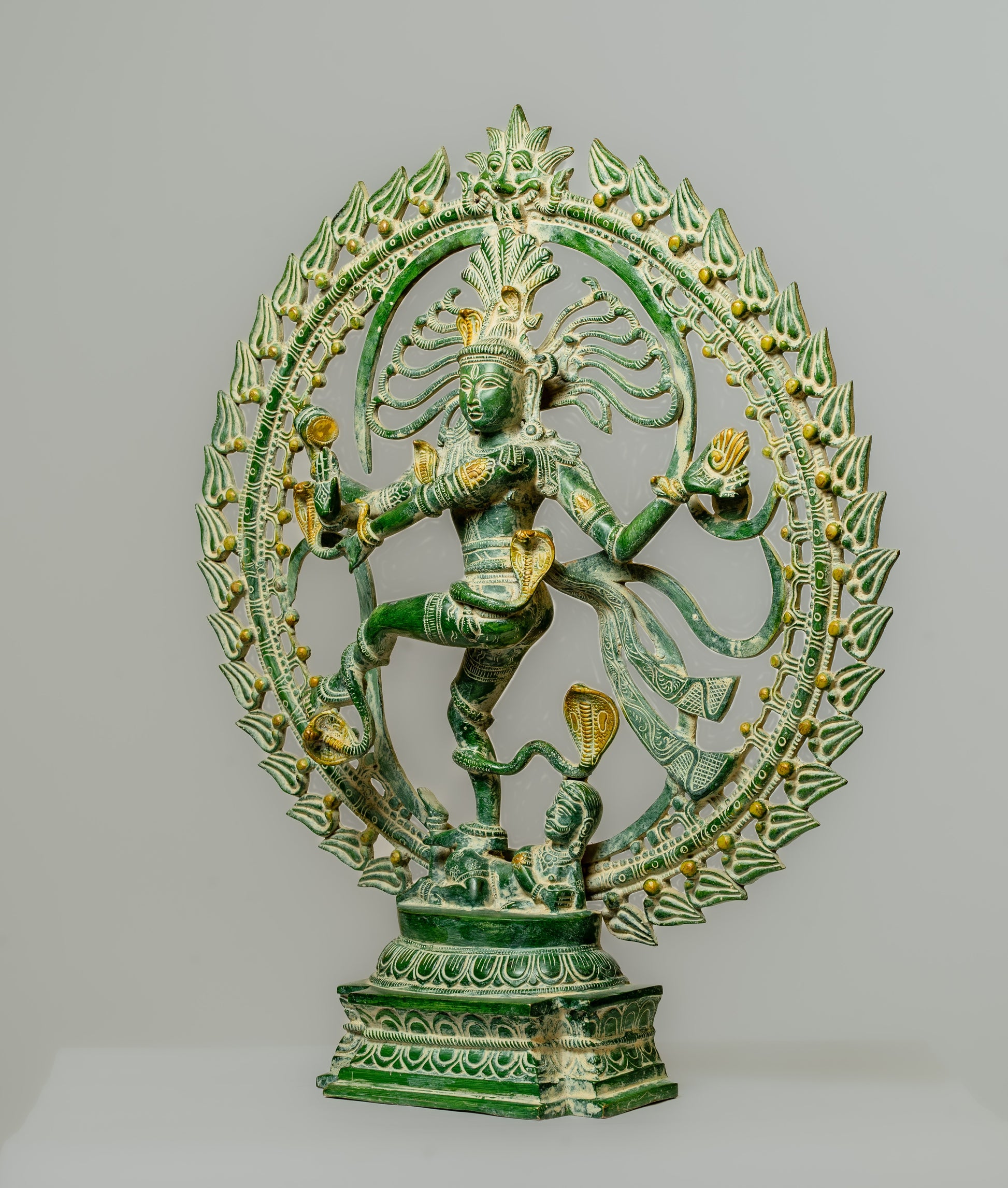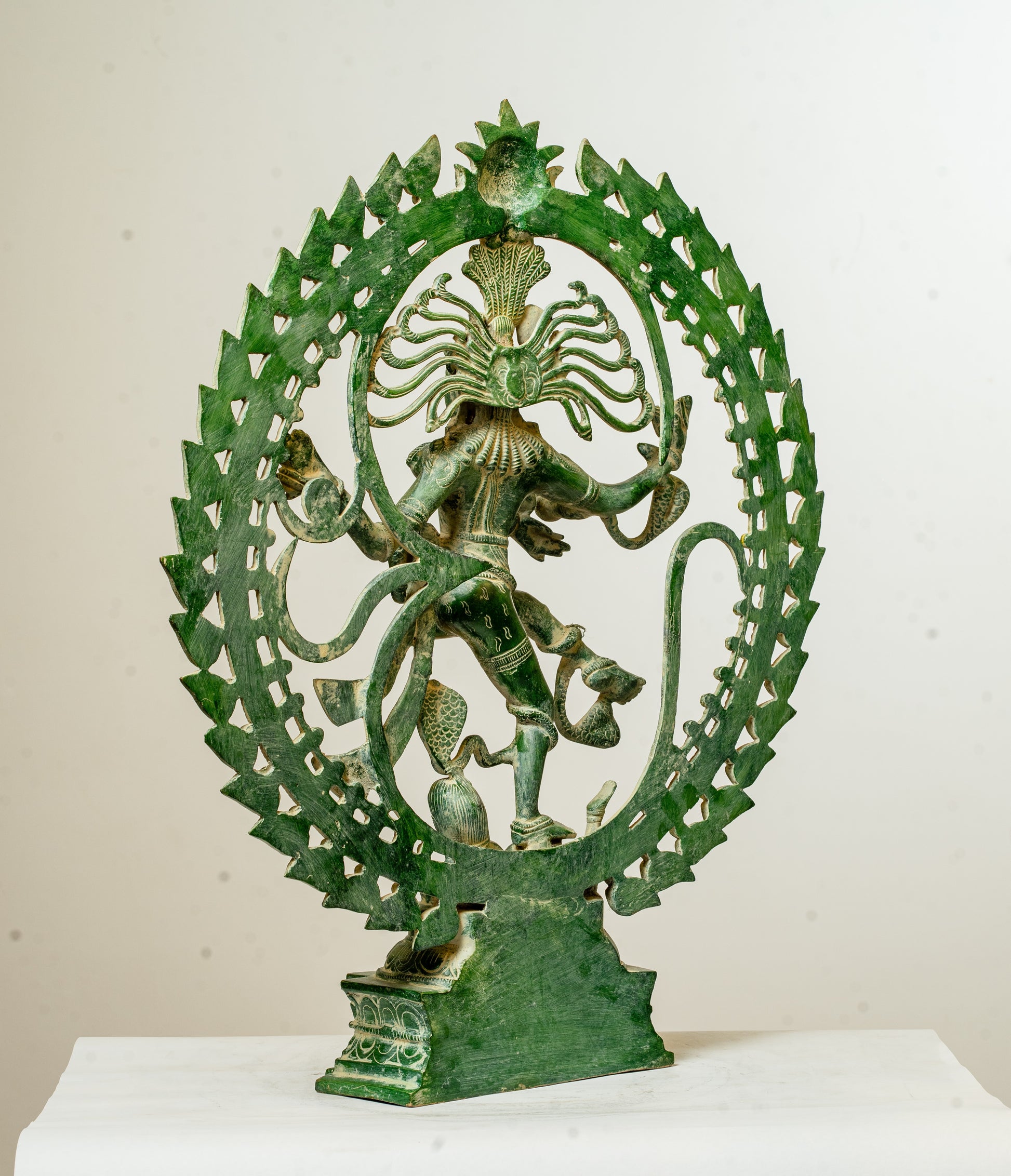 This striking Nataraja statue, representing Shiva's cosmic dance, is finished in an antique green patina, evoking the ancient artistry of Indian culture. The dynamic pose and detailed craftsmanship encapsulate the essence of creation, preservation, and destruction.