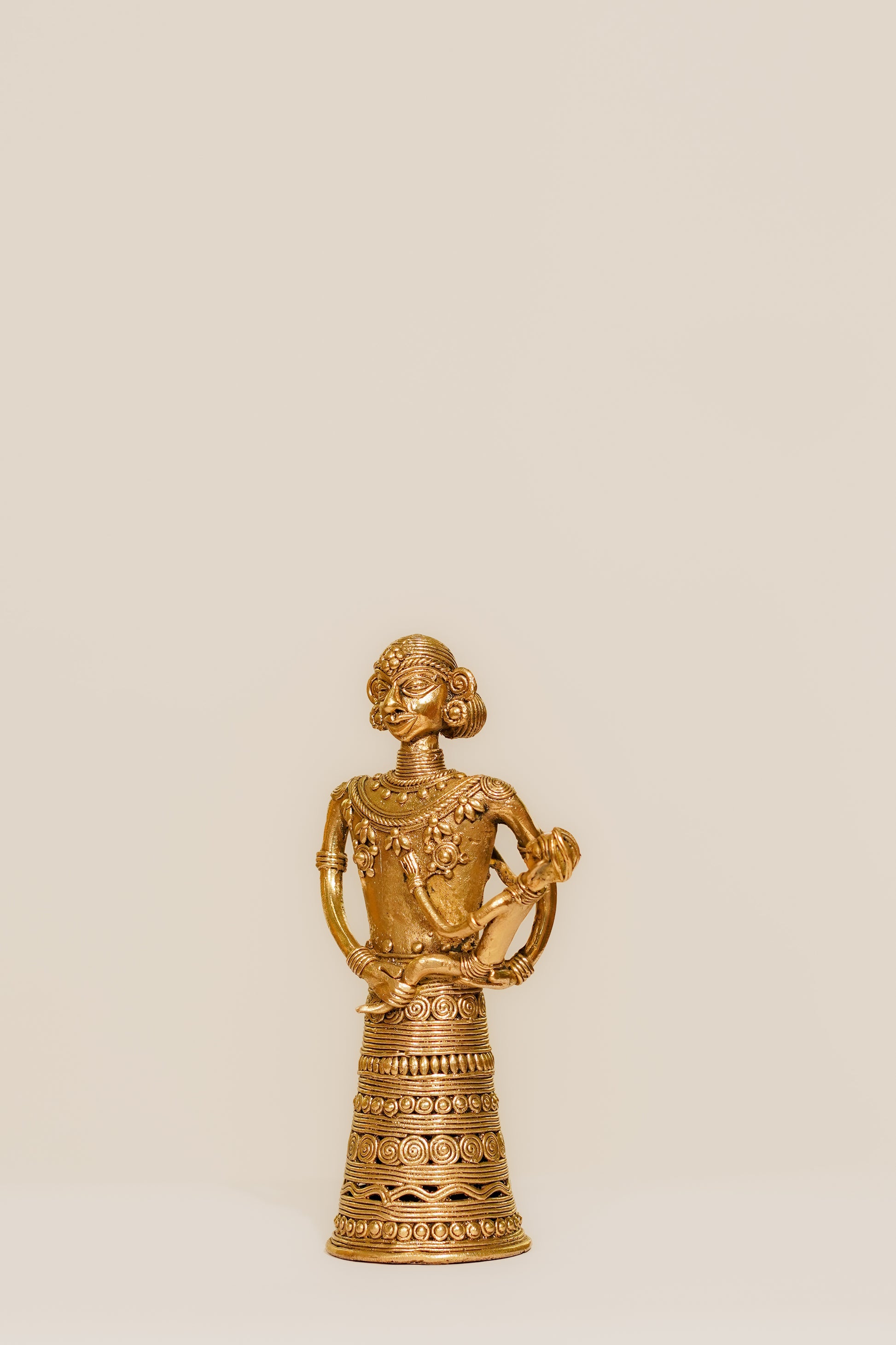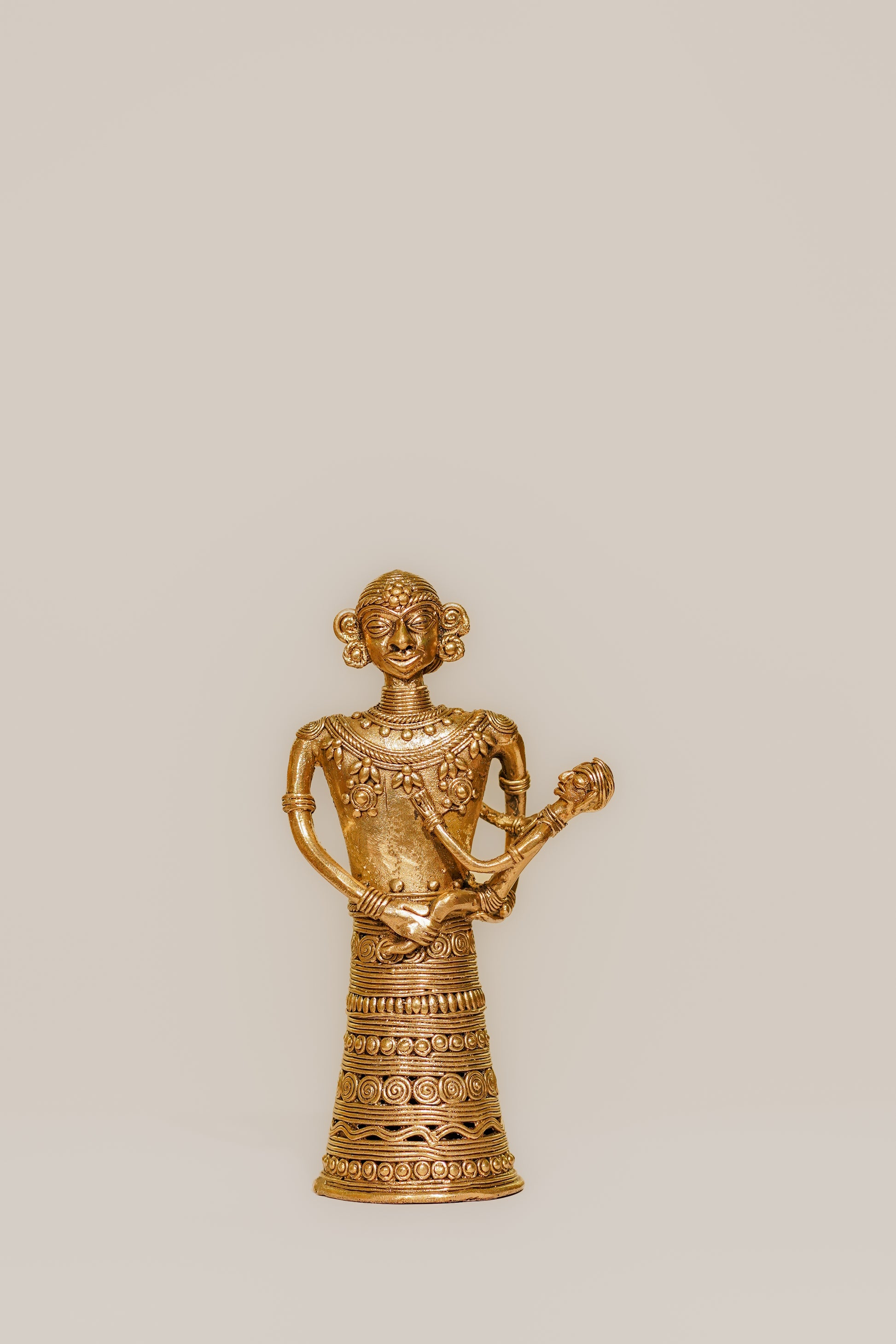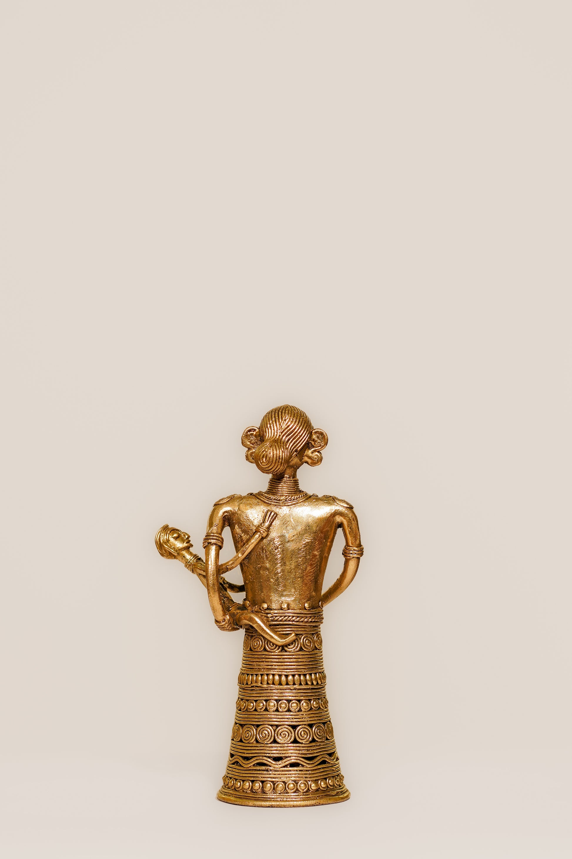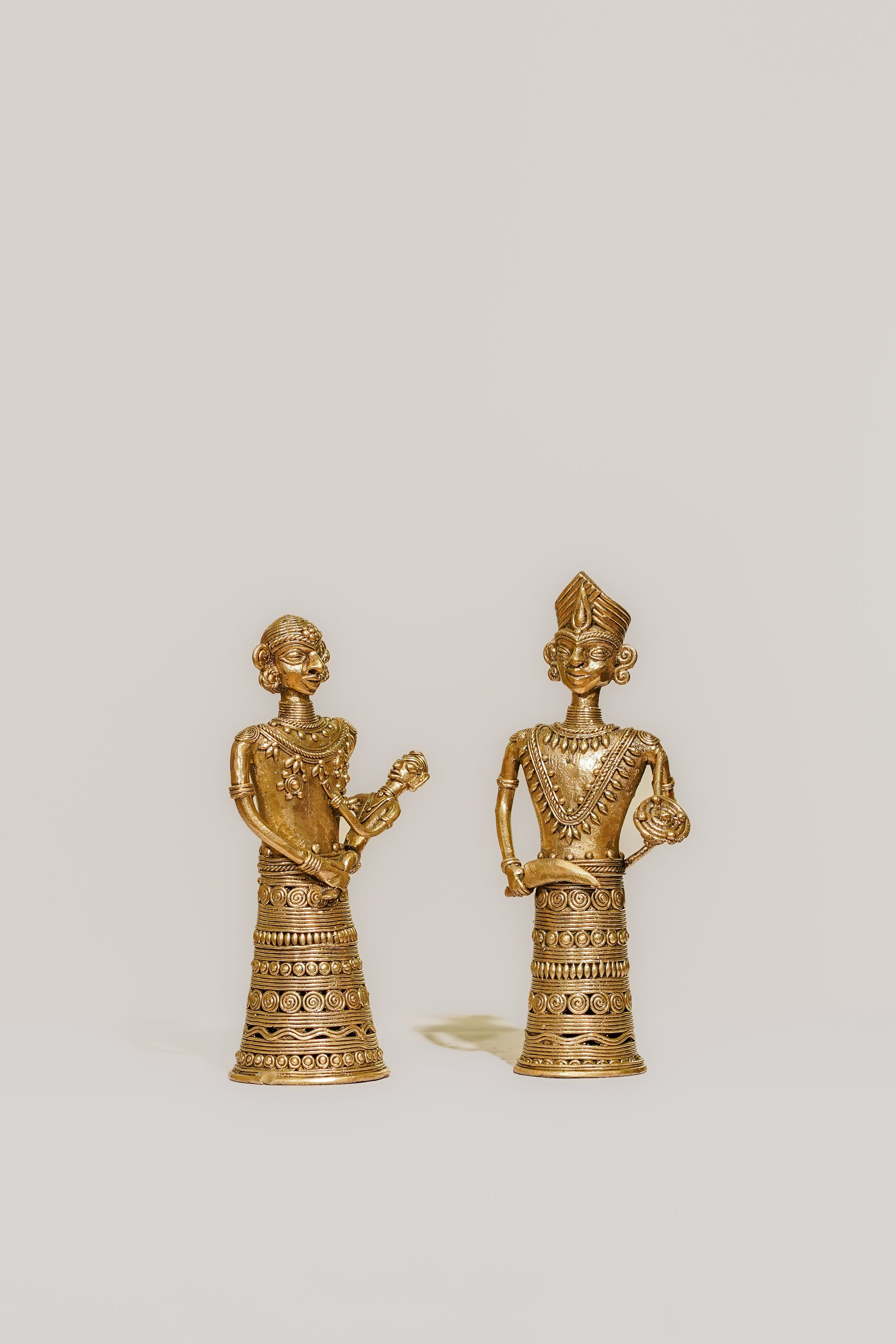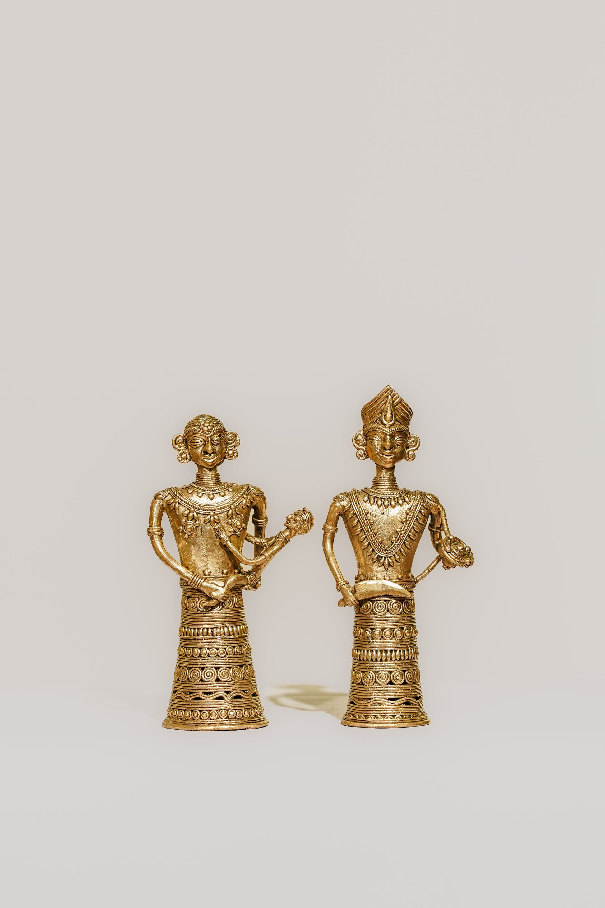 Each figure is intricately detailed, from the regal attire to the ornate headgear, reflecting the tribal interpretations of royalty. The elongated forms, symmetrical postures, and textured patterns are distinctive of the Dhokra style, practiced for over 4,000 years by tribal artisans in central and eastern India.