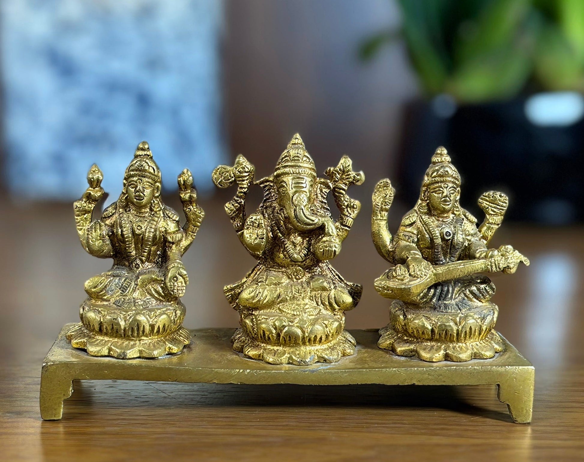 Brass Laxmi Ganesh Saraswati | Bringer of Prosperity, Wisdom and Knowledge | 8cm Brass