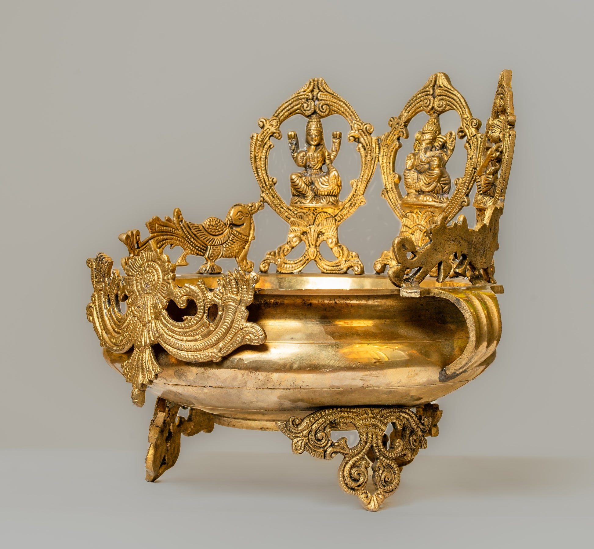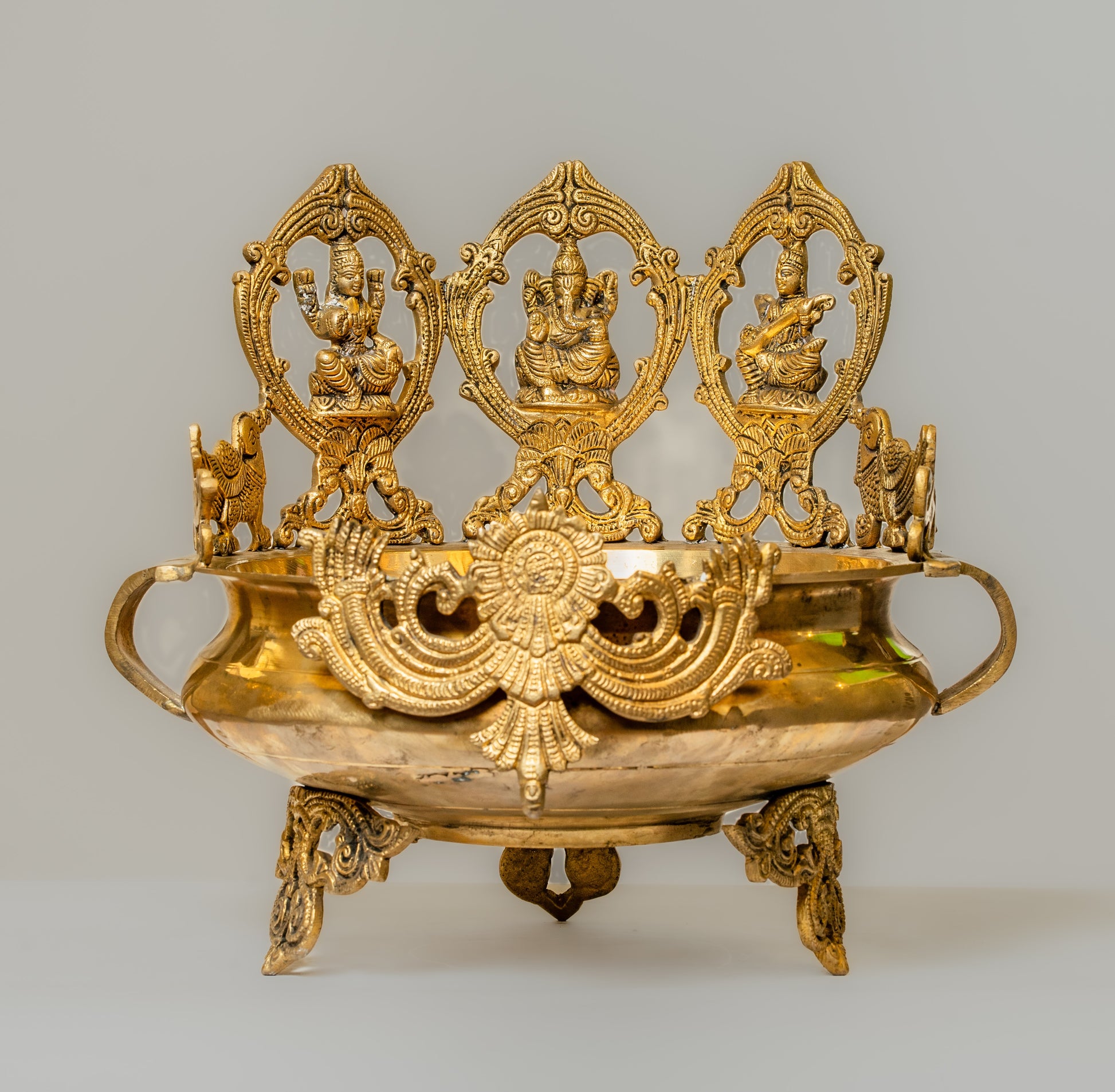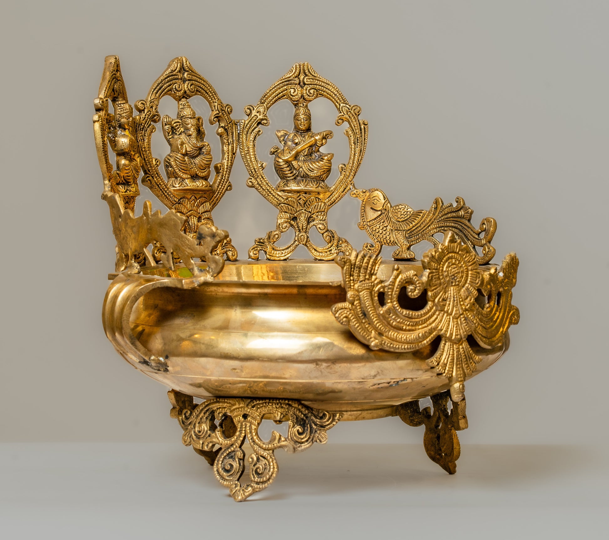 This ornately crafted brass urli features a crown of deity figurines, offering a regal touch to the traditional Indian vessel. Perfect for spiritual decor or for creating a serene ambiance with floating flowers and candles.