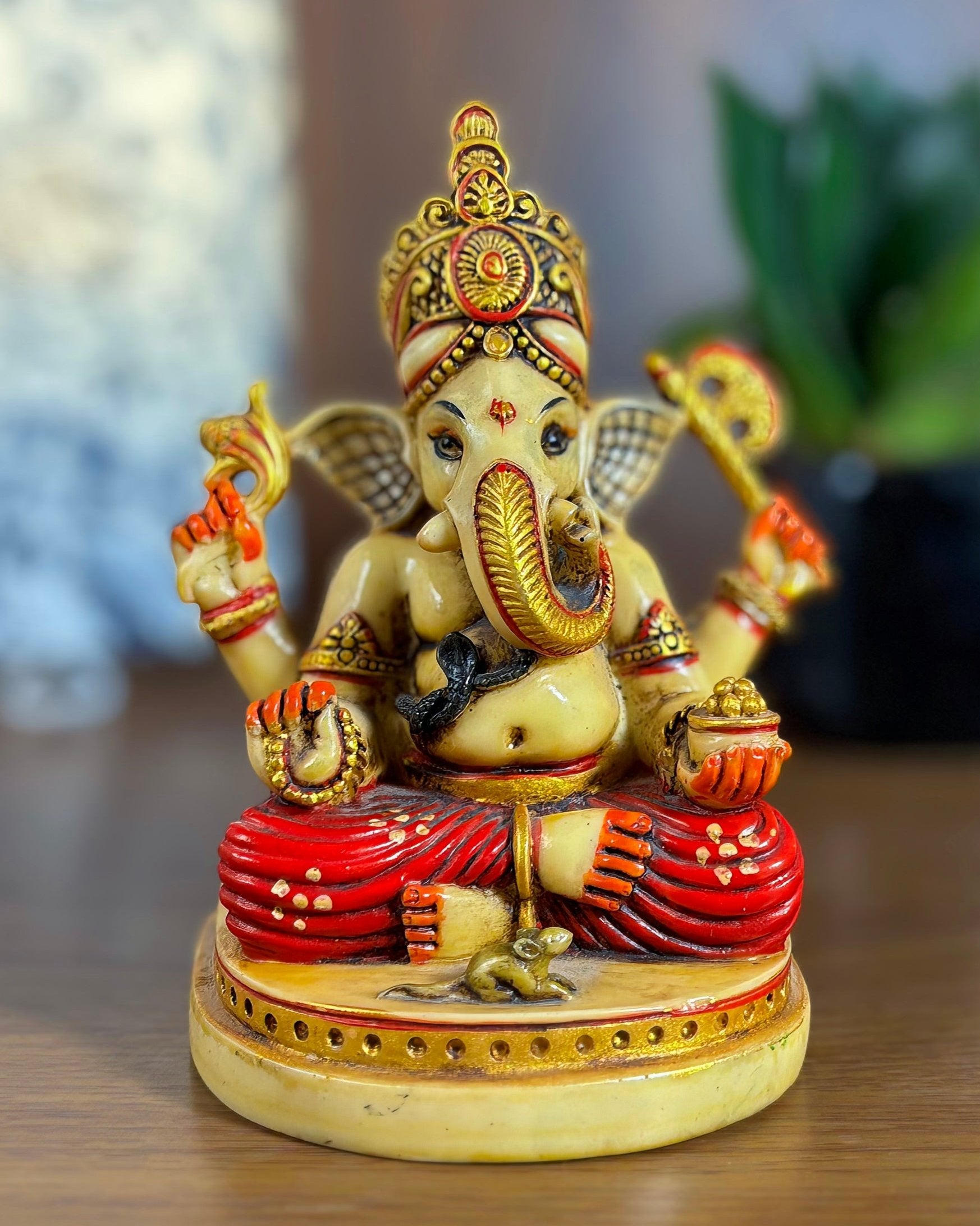 This hand-painted resin statue of Ganesha is a masterpiece of vibrant craftsmanship. Its intricate detailing and rich colors make it a standout decor piece, perfect for any home or workspace, ensuring the recipient is reminded of your thoughtful gift every time they see it