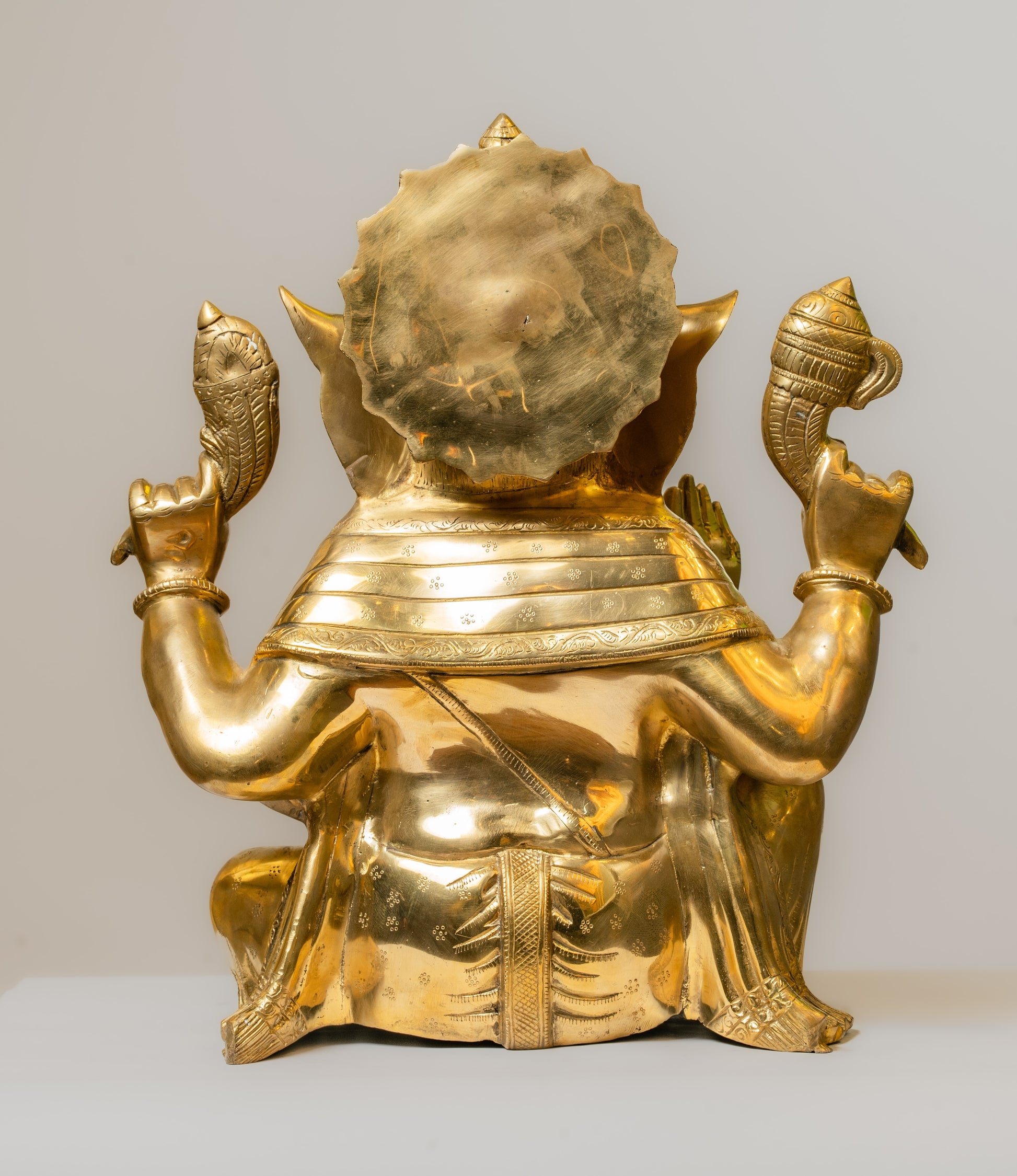 This gleaming brass Ganesha statue, finished in a radiant gold, embodies prosperity and wisdom. Its full-bodied form and detailed carvings make it a striking piece for any devotee or lover of fine artistry.