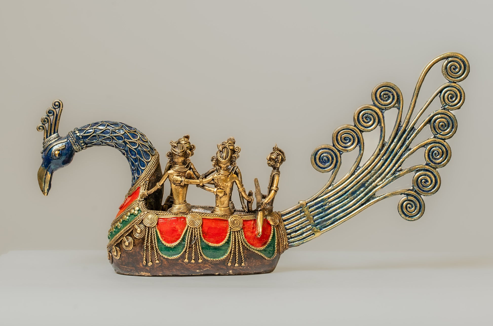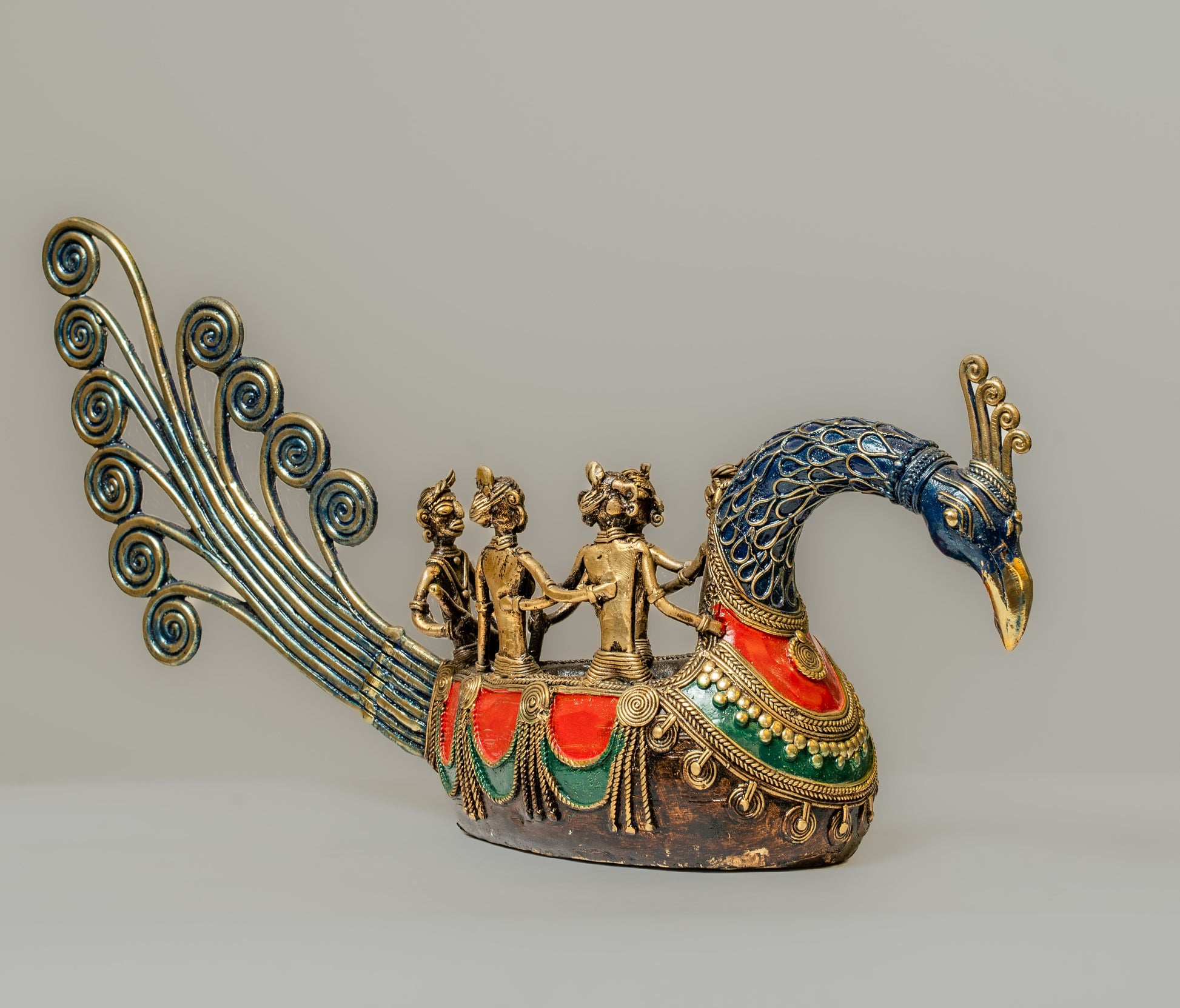 This ornate peacock boat, showcasing the Dhokra art form, is a celebration of Indian craftsmanship. The brass riders are meticulously hand-painted, adding a spectrum of colors to the detailed metalwork, making this piece a vibrant and cultural statement.