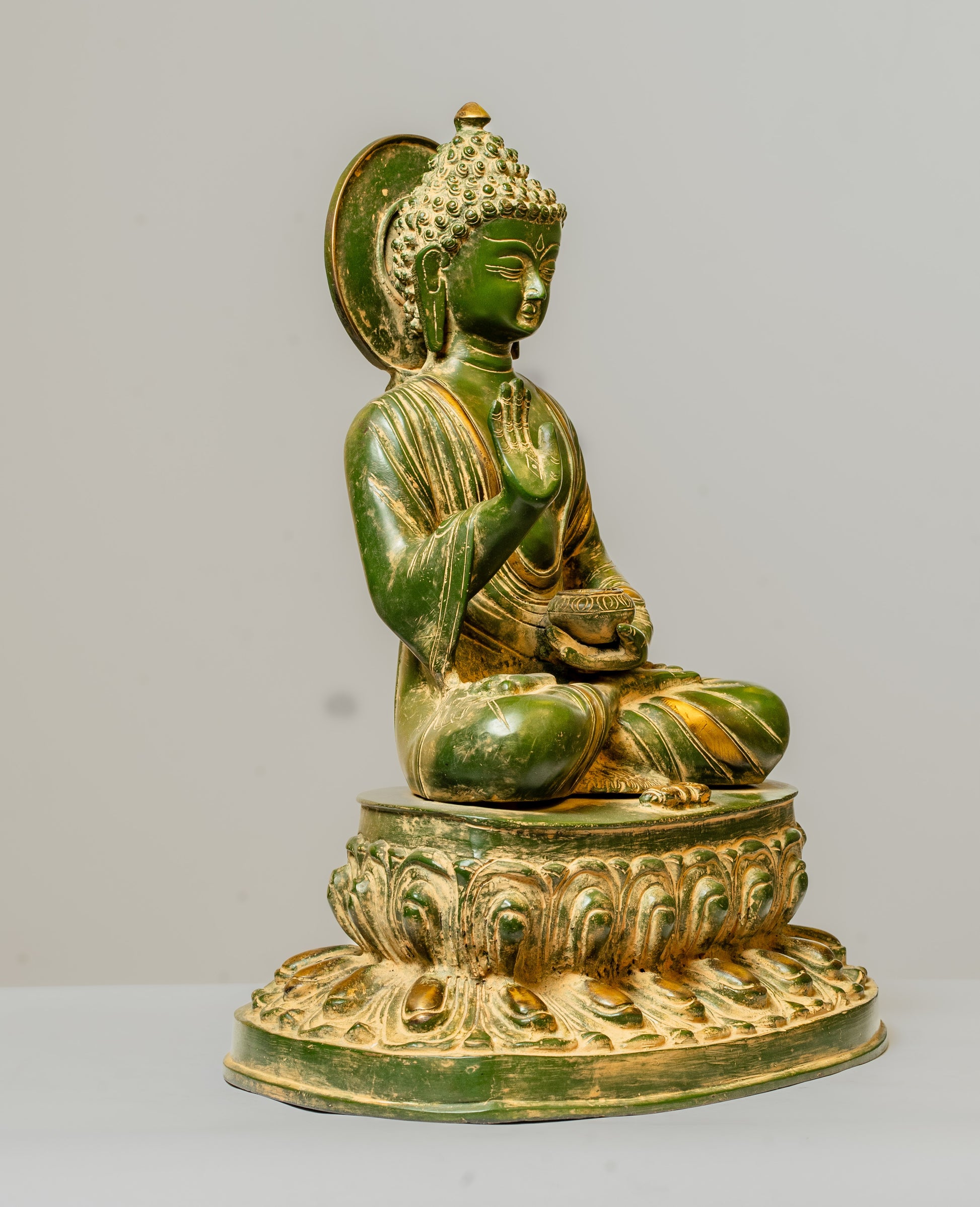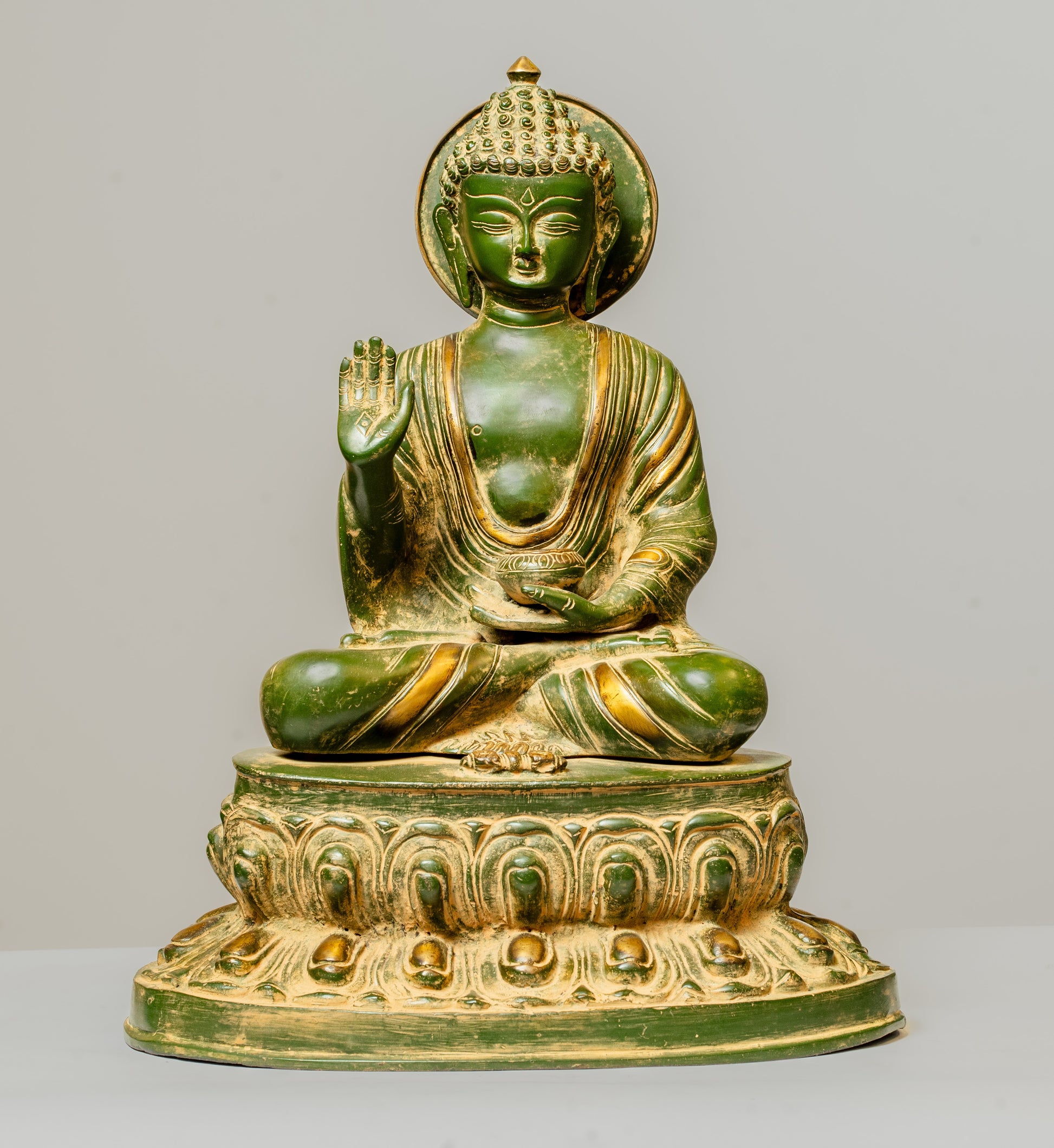 Design: Traditional Buddha posture with a unique verdant antique finish