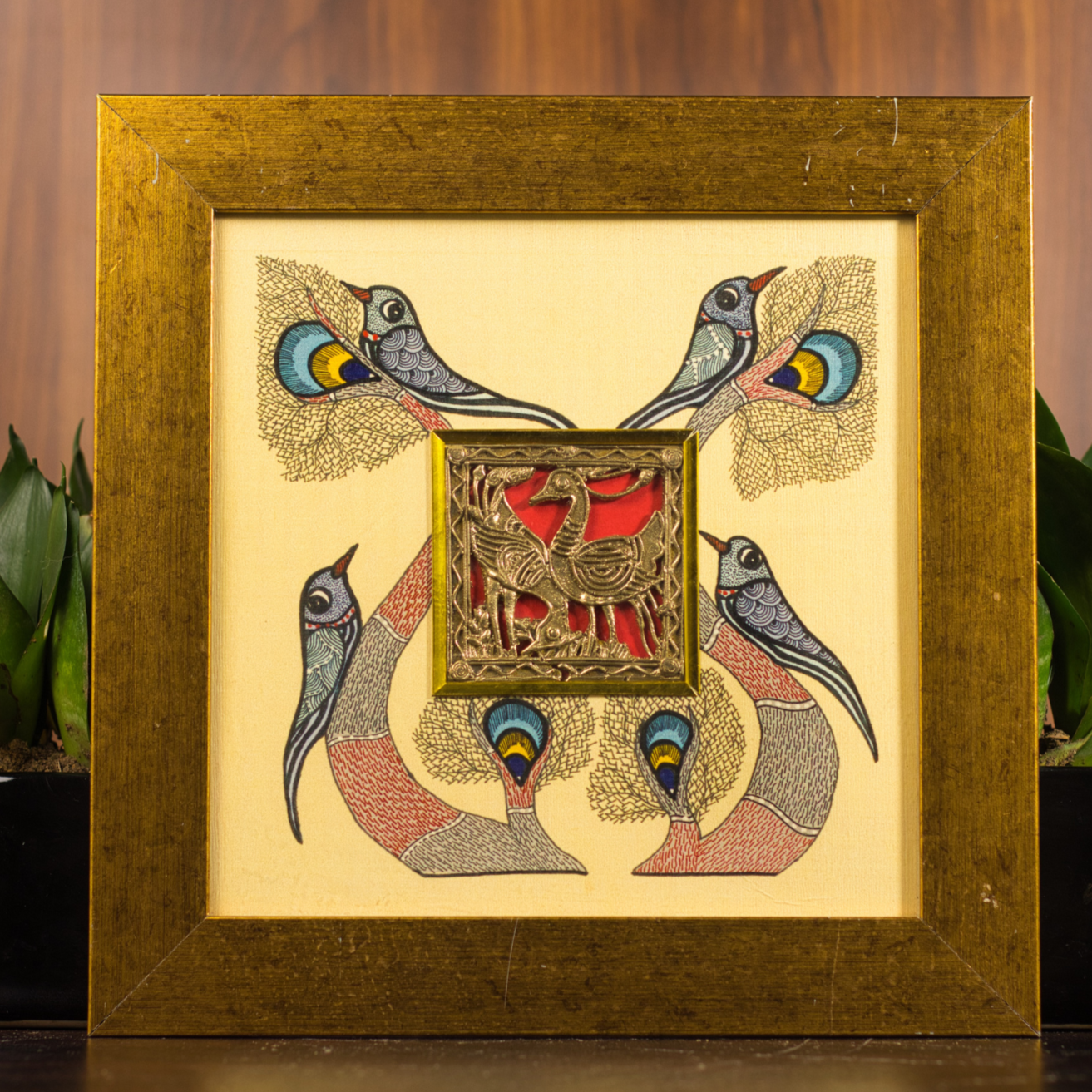 Wall Decor Brass Tribal Frame with Gond Art Painting | 27cm